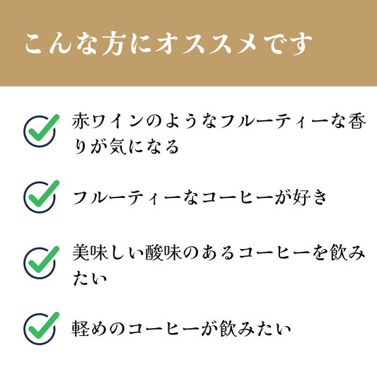 高級ワインのよう、華やかな香りが広がる、完熟チェリー、ゲイシャ以上の衝撃、消えない余韻が素晴らしい