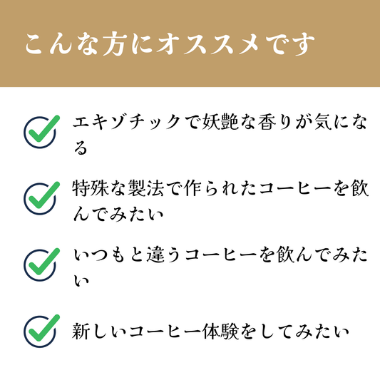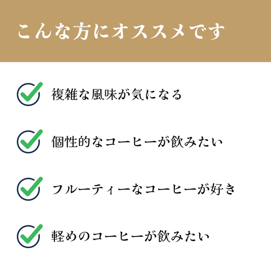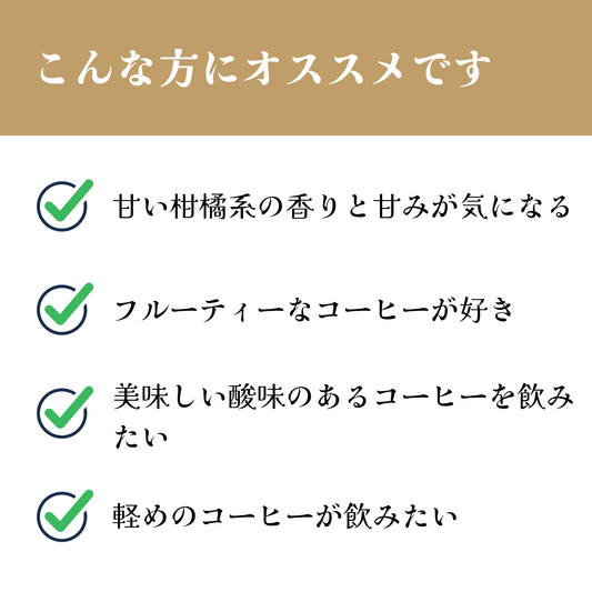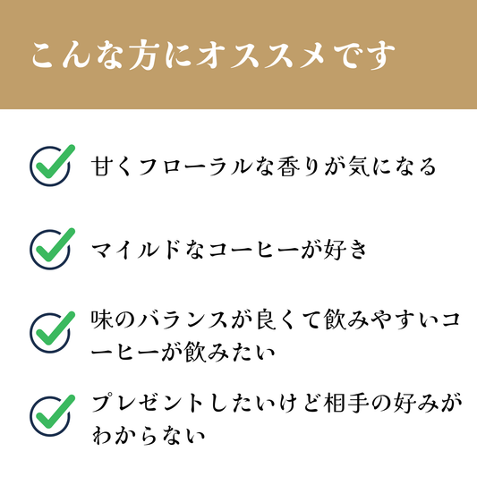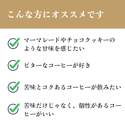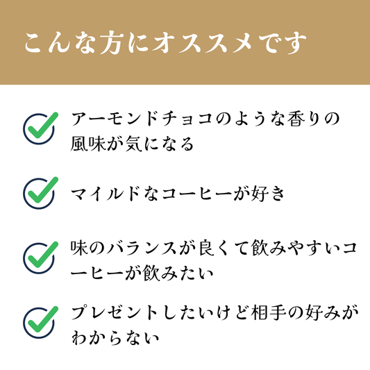 アーモンドチョコのような香り、ドライフルーツやメープルシロップのような甘味、甘い余韻が心地いい、毎日飲みたいコーヒー