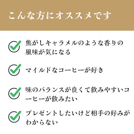 焦がしキャラメルのような香り、キャラメルのような甘味、まったりとした甘い余韻、毎日飲みたいコーヒー
