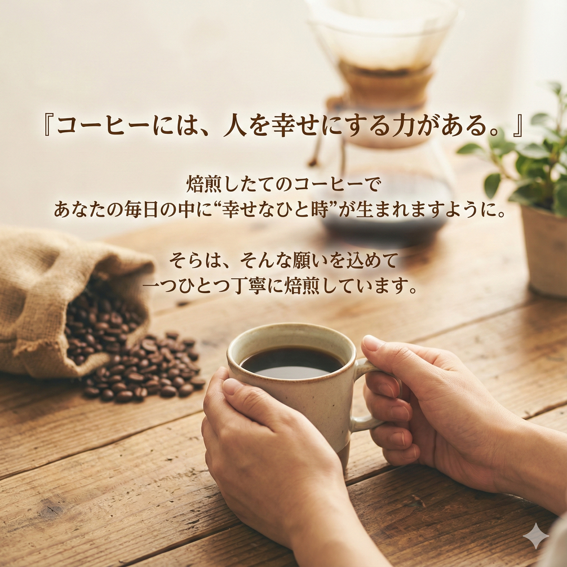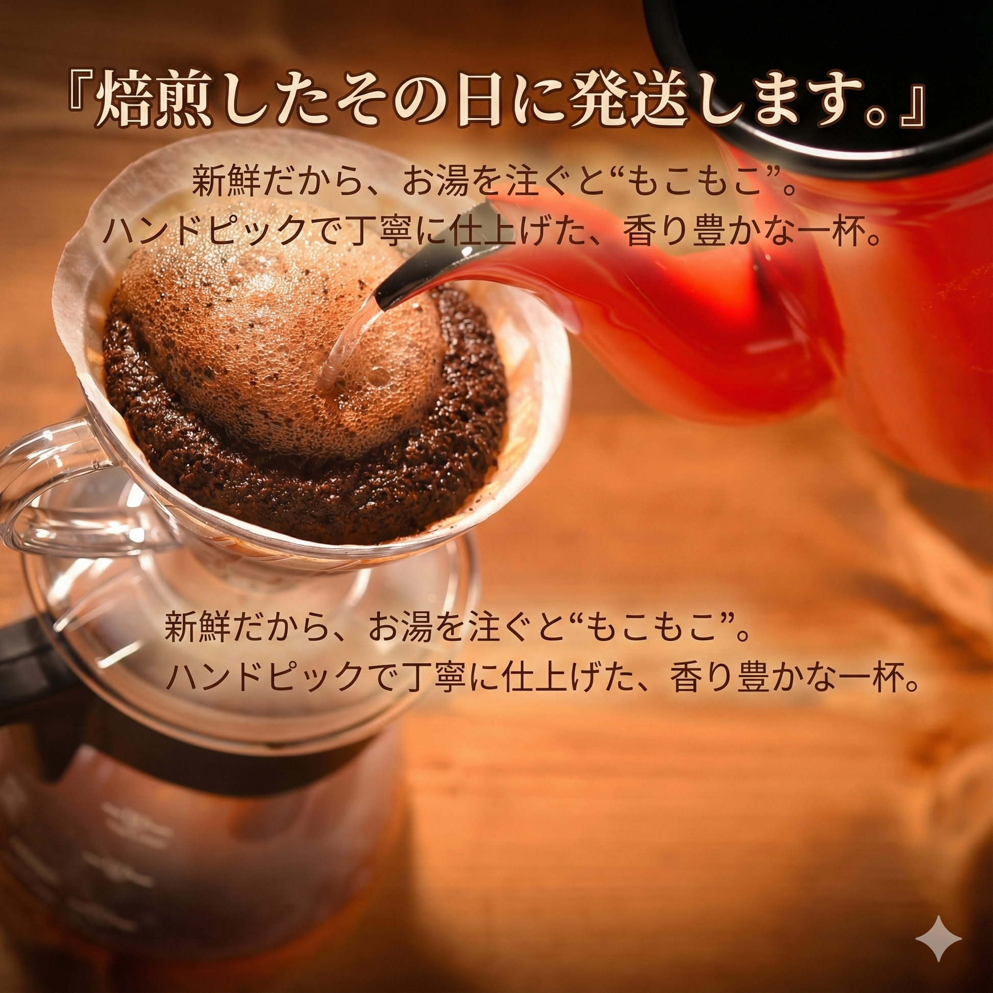 | 特徴 | スペシャルティグレードの高品質豆を使用。ご注文後に焙煎し、できるだけ早くお届けします。 |