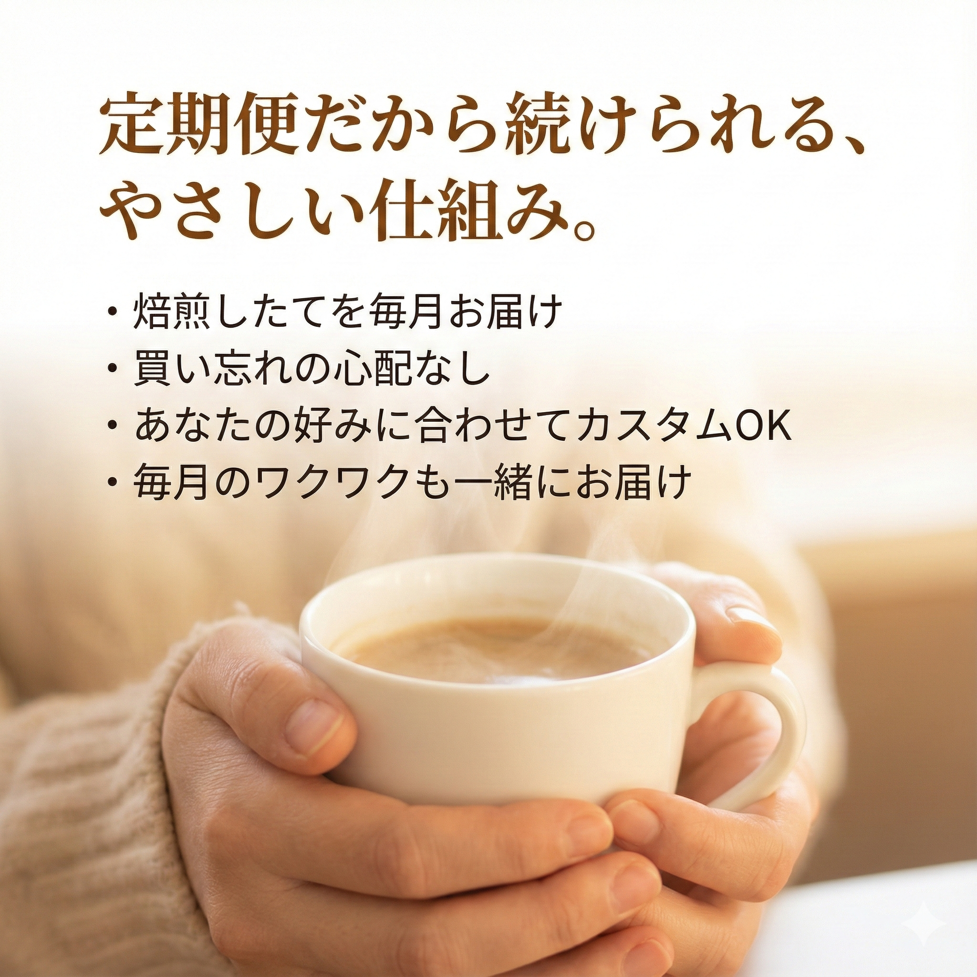 焙煎したてのコーヒー豆を、買い忘れやご注文の手間なく、毎月お届けするサービスです。