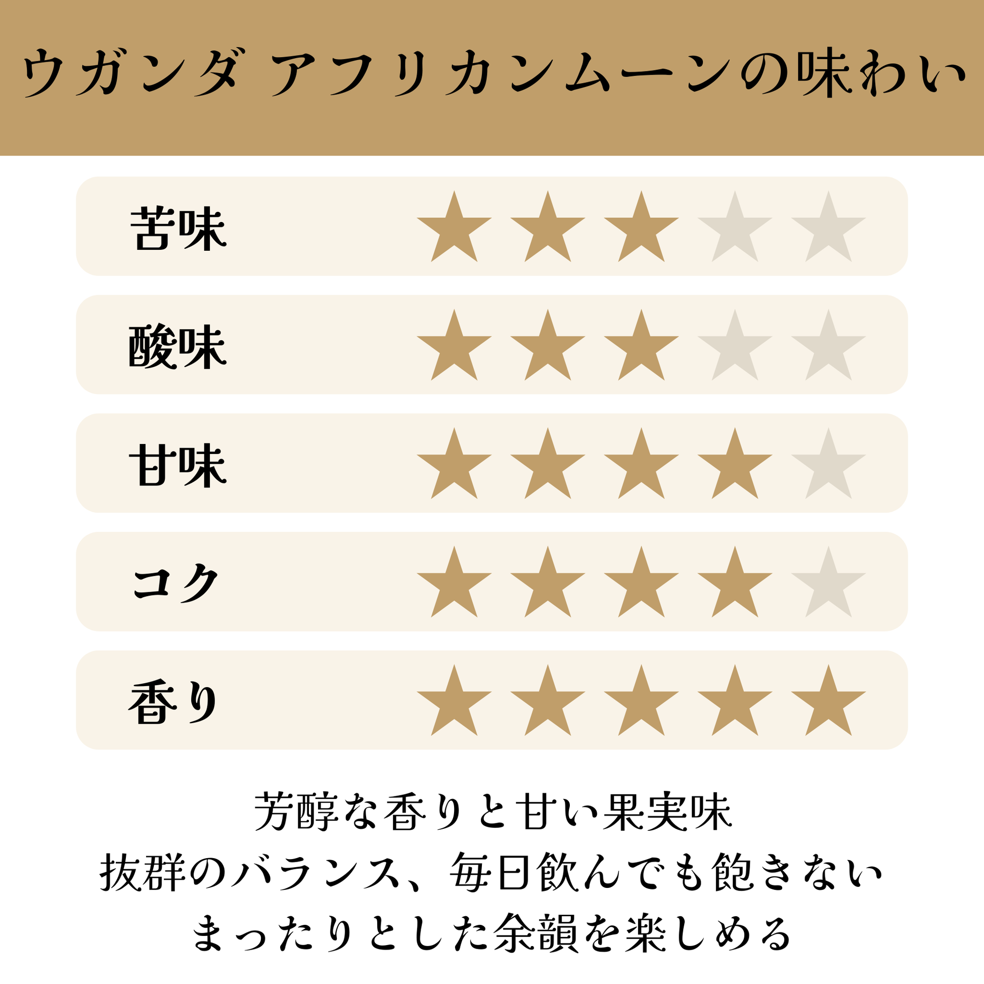 アフリカンムーンは、ウガンダ西部にあるルウェンゾリの麓で、標高が高く、肥沃な土壌と豊富な降雨量で、アラビカコーヒーの栽培条件としては完璧な環境で育てられたものと言えます。